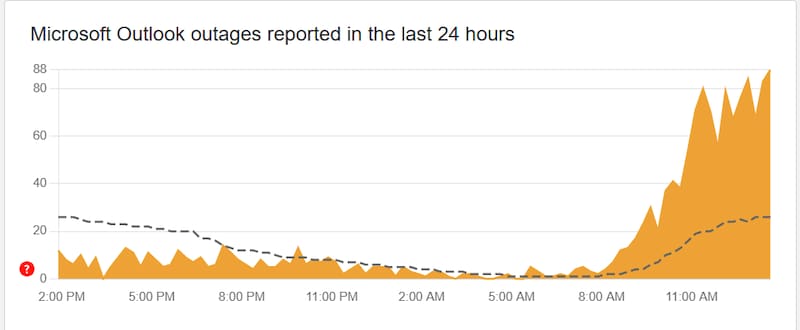 Según la plataforma de monitoreo Downdetector, "Interrupciones de Microsoft Outlook reportadas en las últimas 24 horas" alcanzó picos muy por encima del promedio habitual. Esto confirma que la interrupción no es un problema aislado.