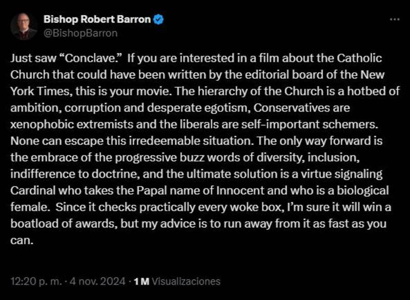 A pesar de ser un éxito de crítica y público, algunos sectores de la Iglesia han expresado su descontento con la película. El obispo Robert Barron, una de las voces más influyentes en el ámbito del catolicismo contemporáneo, ha sido particularmente crítico con la película Cónclave, calificándola de "anticatólica" y "woke".