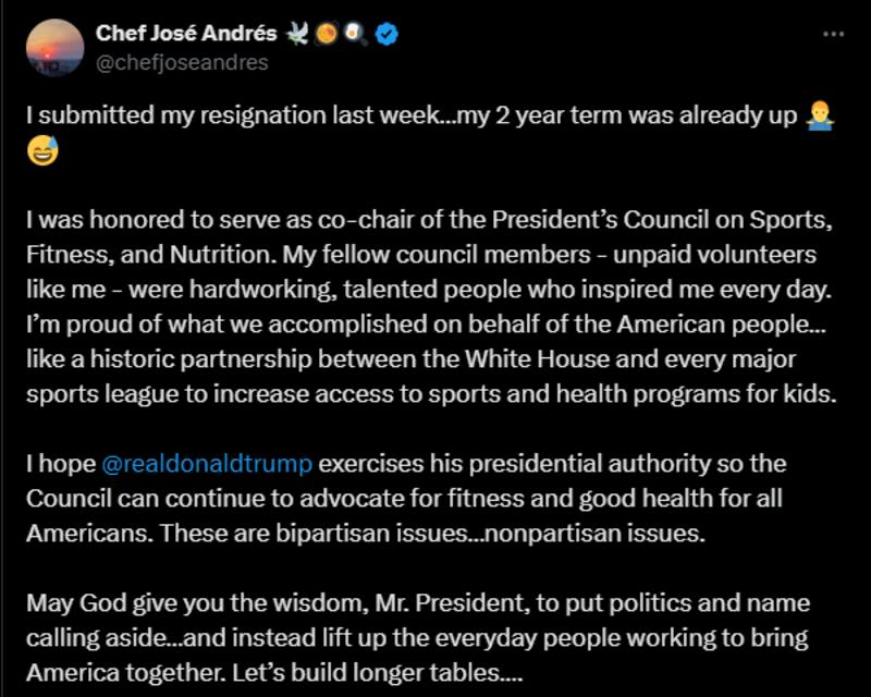 A través de su cuenta en la red social X -antes conocida como Twitter-, José Andrés le respondió a Trump, indicando que ya había renunciado a su puesto la semana pasada.
