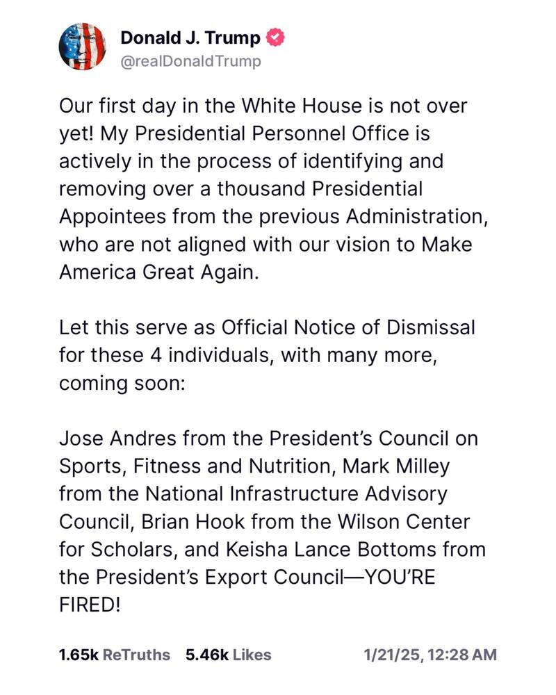 Trump, quien asumió la Presidencia este lunes, también informó del despido del general retirado Mark Milley, conocido por sus críticas hacia el mandatario, al igual que José Andrés.