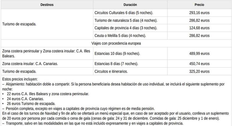 - Transporte de ida y vuelta en el medio de transporte programado, desde la capital de provincia donde resida la persona usuaria hasta el hotel de destino y regreso, excepto en la modalidad de viajes sin transporte y viajes a capitales de provincia.