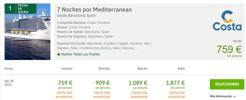 En este caso, la empresa ofreció un viaje en barco por el Mar Mediterráneo por un total de 7 noches y un precio base de 759 euros por persona. El recorrido incluye 5 destinos diferentes de España y de Italia con todo incluido.
