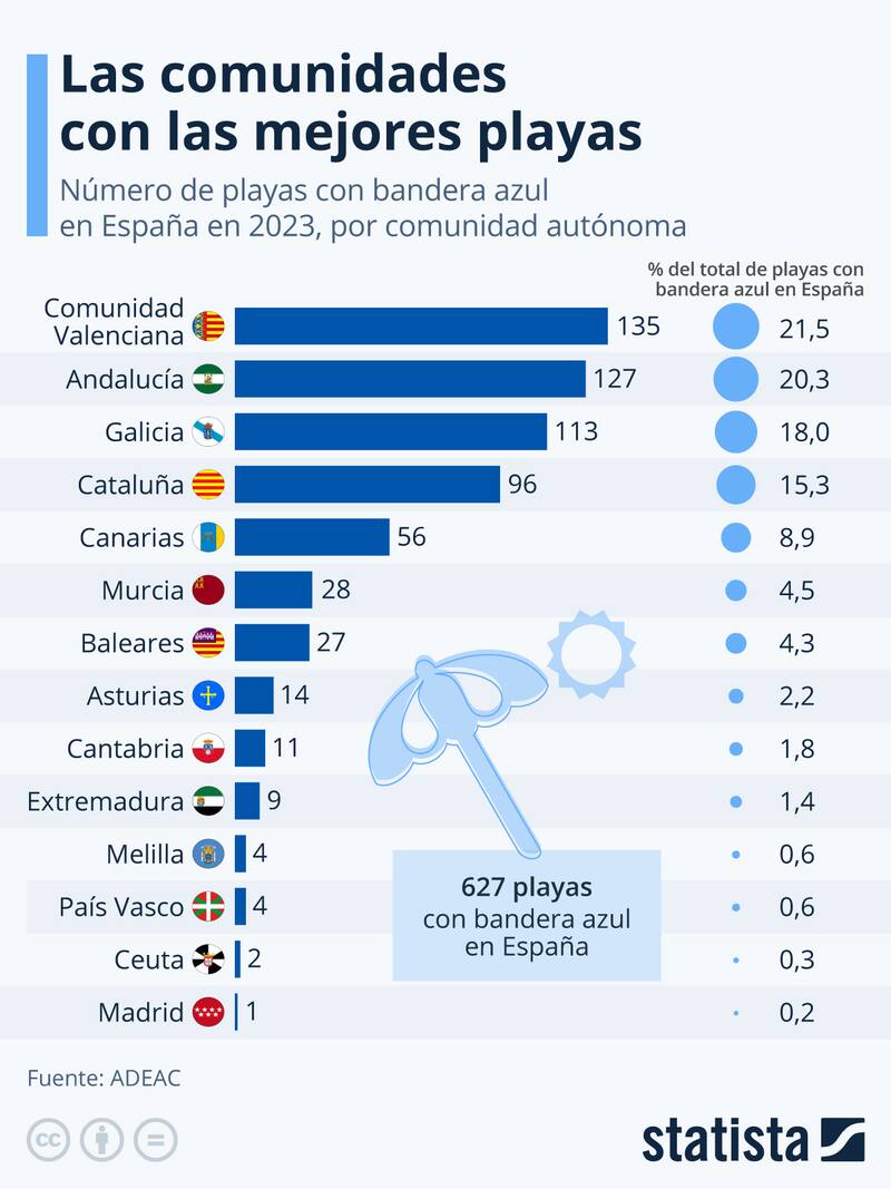 Según datos de la ADEAC, "el 15% de las playas con bandera azul del mundo están en territorio español". Así lo explica un informe de Statista que analiza cuáles son las mejores playas de España.
