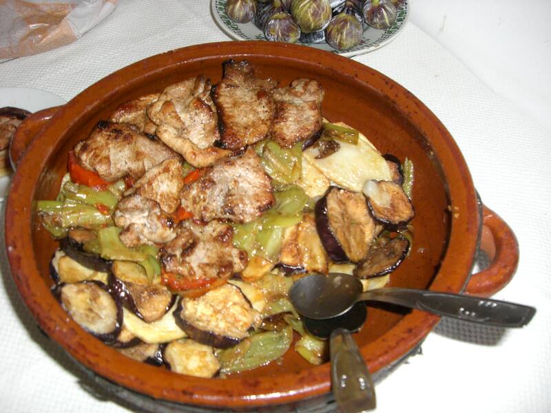 - Colocar el tomate con cebolla en cazuelas de barro. Repartir encima las rodajas de patata, la berenjena, el pimiento y terminar con más salsa de tomate. Hornear a 200ºC unos 10 minutos.
