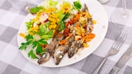 - Poner una sartén al fuego con un chorrito de aceite de oliva. Añadir los pimientos y una pizca de sal. Saltear el conjunto unos minutos. Retirar los pimientos y reservar.