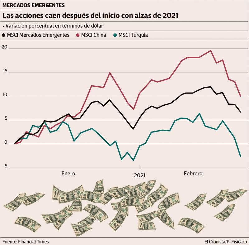 El índice CSI 300 de acciones chinas retrocedieron alrededor de 6% en dólares desde su máximo de febrero, mientras que el mercado tecnológico ChiNext de Shenzhen, se hundió 13%. Turquía, otro gran mercado emergente, registró un descenso cercano a 8% desde el 15 de febrero, según un índice MSCI.