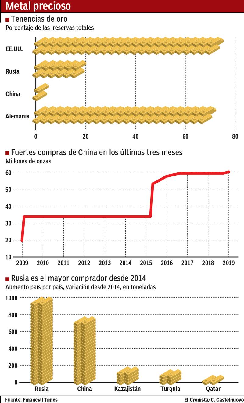El banco central del gigante oriental, el Banco Popular de China, adquirió cerca de 32 toneladas de oro en los últimos tres meses. Si mantiene sus compras al actual ritmo, superará a Rusia y a Kazajistán, que fueron los principales adquirentes en 2018 pero que últimamente han reducido sus adquisiciones.