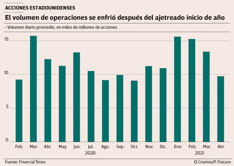 El menor trading de acciones del mes pasado contrasta con el frenético primer trimestre, durante el cual la actividad se intensificó en los "papeles meme" como GameStop y AMC, lo que elevó fuertemente las ganancias de los bancos, agentes de bolsa y formadores de mercado que operan en el epicentro de los mercados globales.