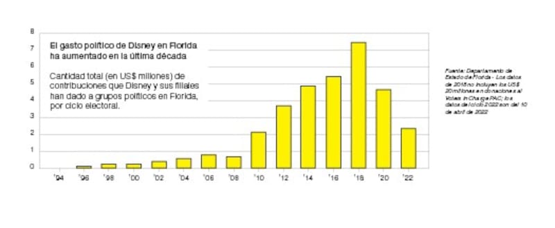 En los 55 años transcurridos desde que Walt Disney y su hermano mayor Roy eligieron Florida como sede de Disney World, la empresa "ha conseguido prácticamente todo lo que ha querido del gobierno de Florida", afirma Aubrey Jewett, profesor asociado de ciencias políticas de la Universidad de Florida Central. "Si alguien se quejara de Disney, normalmente vendría de los demócratas y los progresistas", añade. Disney ha sido un generoso donante de los políticos de Florida y sus campañas. Entre ellos está DeSantis, que recibió unos US$ 100.000 en contribuciones de Disney entre 2019 y 2021. Pero varios otros republicanos influyentes que han tendido a votar por la legislación favorecida por Disney parecían inmunes a su lobby ahora. "Aquí es donde está [el partido republicano] ahora mismo", dice un alto asesor de Disney. "Si tenés a alguien con la fuerza de gravedad de DeSantis tirando en una dirección y vos vas en la otra, ahora tenés un problema".