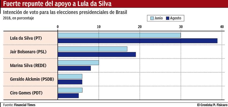 Las encuestas muestran que Bolsonaro, ex capitán del ejército y legislador, lleva la delantera en una elección sin Lula da Silva, con sólo 22%, comparado con el 19% de junio. Si puede mantener este apoyo, probablemente gane en una segunda vuelta electoral.