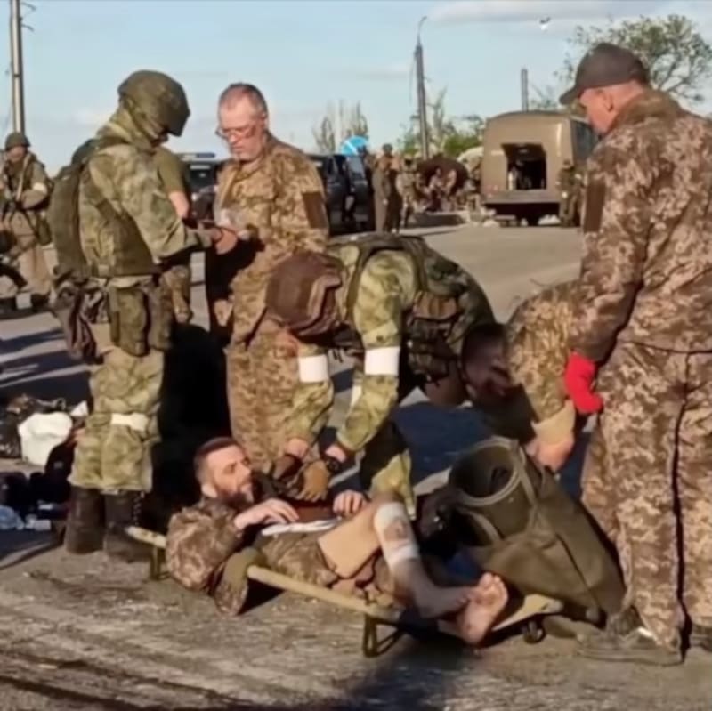 Los videos publicados por el Ministerio de Defensa ruso mostraban a las tropas ucranianas saliendo rengueando de Azovstal con las manos en alto. Fueron recibidas por soldados que los cachearon en busca de armas y comprobaron si tenían tatuajes antes de subirlos a los buses que los llevarían a la cárcel.