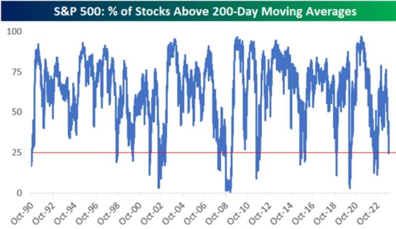 Con el ajuste actual en los índices, el porcentaje de acciones del S&P500 que opera por encima de la media de 200 días es 24%, siendo esta la primera lectura por debajo del 25% en poco más de un año.