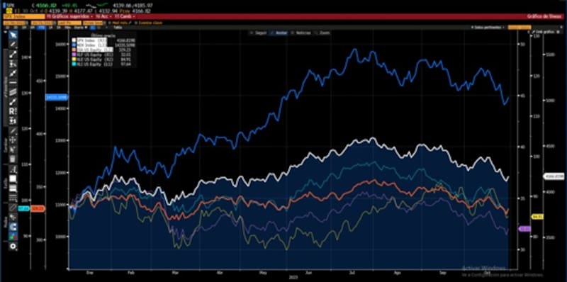 "Los rendimientos de los bonos del Tesoro están subiendo ante la expectativa que la Fed mantenga las tasas de interés altas por un tiempo más prolongado. Con estos niveles de tasas de interés, que enfrían la demanda agregada, el costo a pagar es una desaceleración en el nivel de actividad, con una recesión en el horizonte. Así, empresas de sectores de bienes de consumo básico y más defensivas, encuentran su atractivo relativo", dijo Flavio.