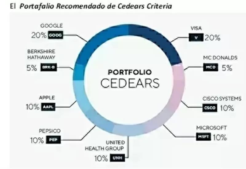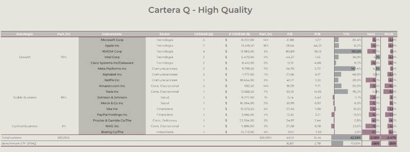 Entre los papeles que están dentro de la cartera se encuentran Microsoft, Apple, Nvidia, Intel, Cisco, Meta, Google, Netflix, Amazon, Tesla, J&J, P&G, Boeing, entre otros.