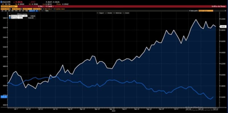 El mercado accionario está operando a la baja debido a que los inversores vienen incorporando el escenario de una Reserva Federal que dejaría las tasas de interés en niveles altos por más tiempo.