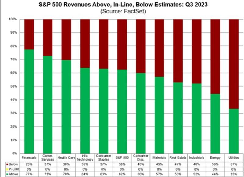 Según FactSet, hasta ahora, el 62% de las empresas que forman parte del S&P500 y que han reportado sus balances, han superado las estimaciones de ingresos para el tercer trimestre, lo que está por debajo del promedio de 5 años del 68% y por debajo del promedio de 10 años del 64%.
