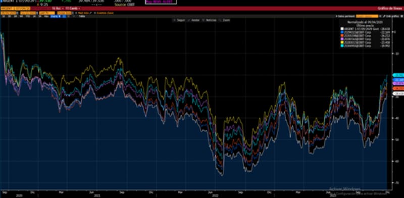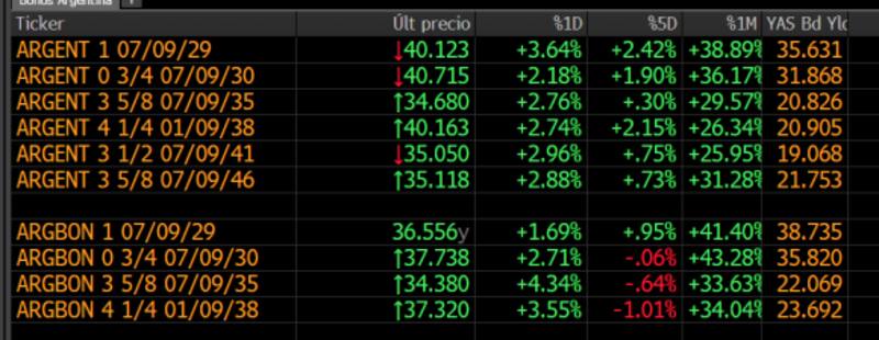El tramo corto de la curva sube 3,6% en el Global 2029 y 2,1% en Global 2030. En el tramo medio, los bonos avanzan 2,76% en el Global a 2035 y 2,74% en el bono a 2038.