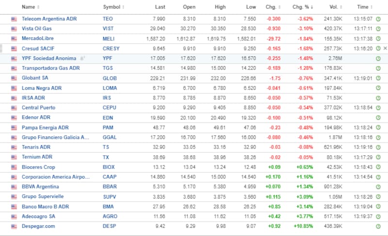 Las debilidades son lideradas por las acciones de Telecom que bajan 3,6%, seguida por Vista, Mercado Libre, Cresud, YPF y TGS que bajan entre 1,2% y 3,1%.