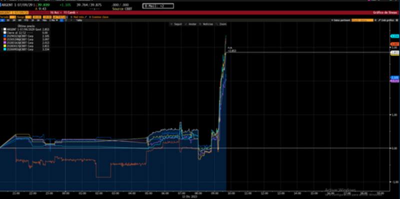 Todos los tramos de la curva soberana argentina abrieron al alza luego de los anuncios de un fuerte ajuste fiscal por parte del ministro de economia, Luis Caputo. Los bonos operan en su mayor valor desde marzo de 2022.