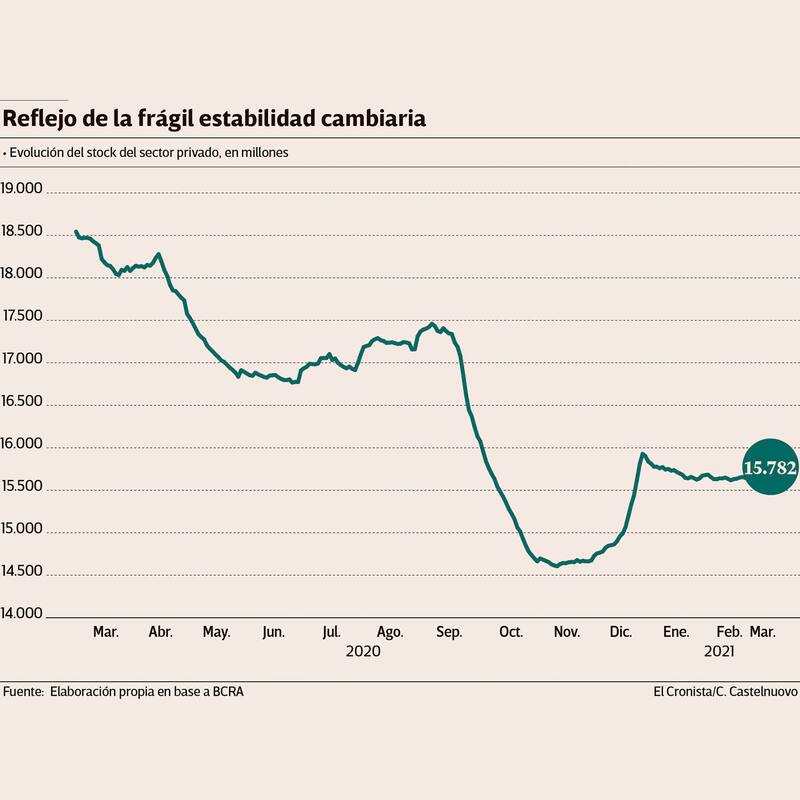 La parte positiva de esta estabilidad queda reflejada en que los depósitos en dólares del sector privado se han mantenido prácticamente neutros, por encima de los u$s 15.000 millones, en lo que va del año. Luego de haber trepado u$s 1255 millones en diciembre, ante el incentivo que significa eludir el pago del impuesto de Bienes Personales, acumulan hasta el 8 de marzo -último dato disponible- una caída de u$s 165 millones. El retroceso, entonces, representa tan solo un 13% del aumento observado en diciembre.
