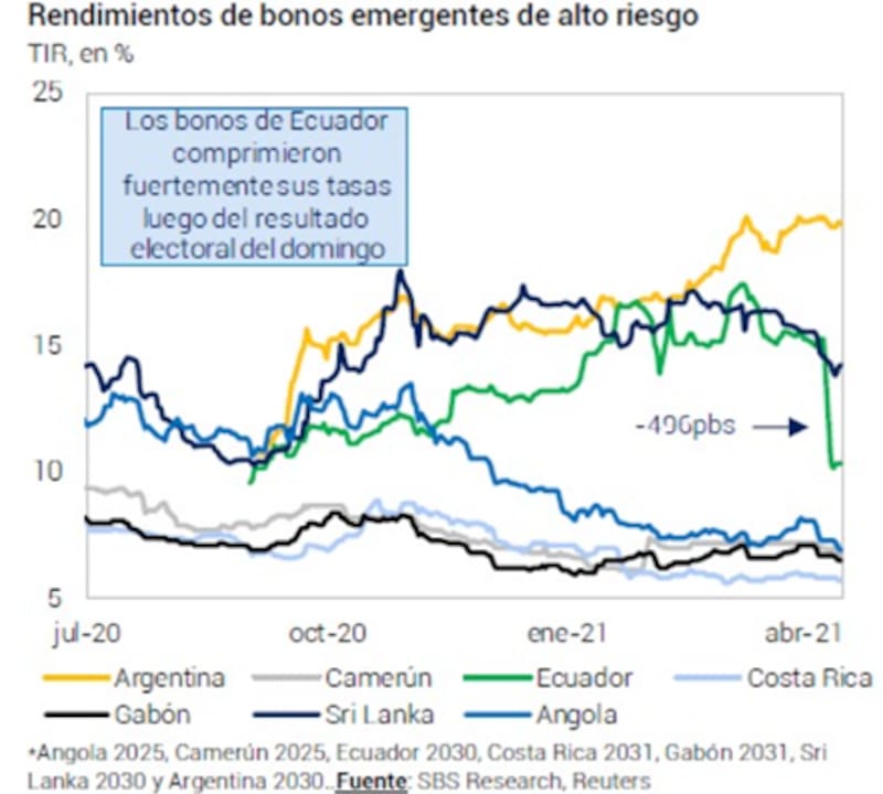 "Mas allá de la buena dinámica de los bonos de Ecuador tras las elecciones, no vemos que el único catalizador que pueda llegar a generar efectos sobre los bonos sean las elecciones de medio término, sino un arreglo con el FMI. Creo que este último podría ser un catalizador más genuino desde el punto de vista que deberían cambiar los fundamentos macroeconómicos a largo plazo más allá del resultado electoral" afirmó.