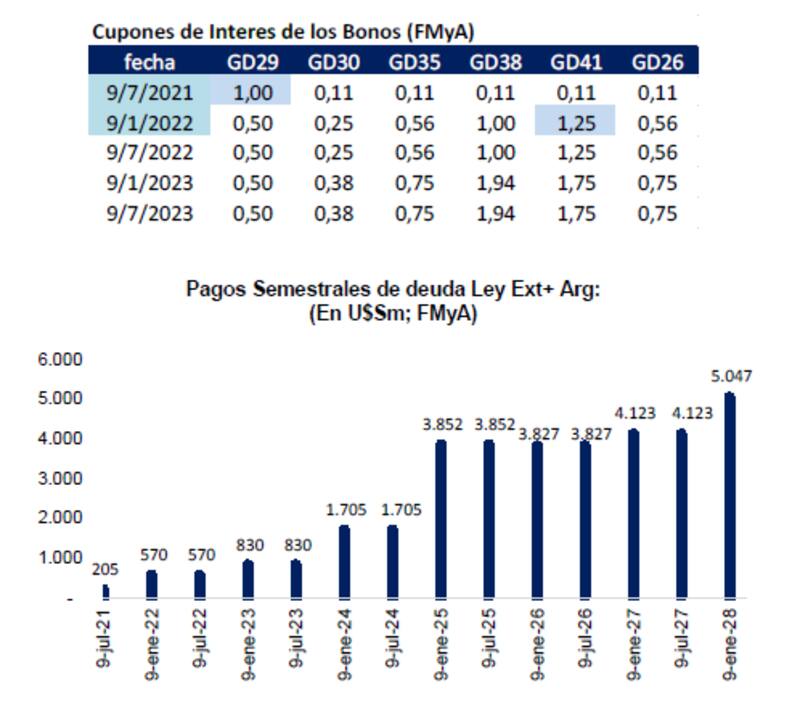Según datos provistos por Marull, el 9 de julio de 2021 el Gobierno tiene que pagar el primer vencimiento de u$s 205 millones, porque el GD29 paga 1% y el resto de los bonos 0,11%. Desde ahí empiezan a "devengar mayores tasas" el resto de los bonos, destacándose el GD41. Serían u$s 570 millones.