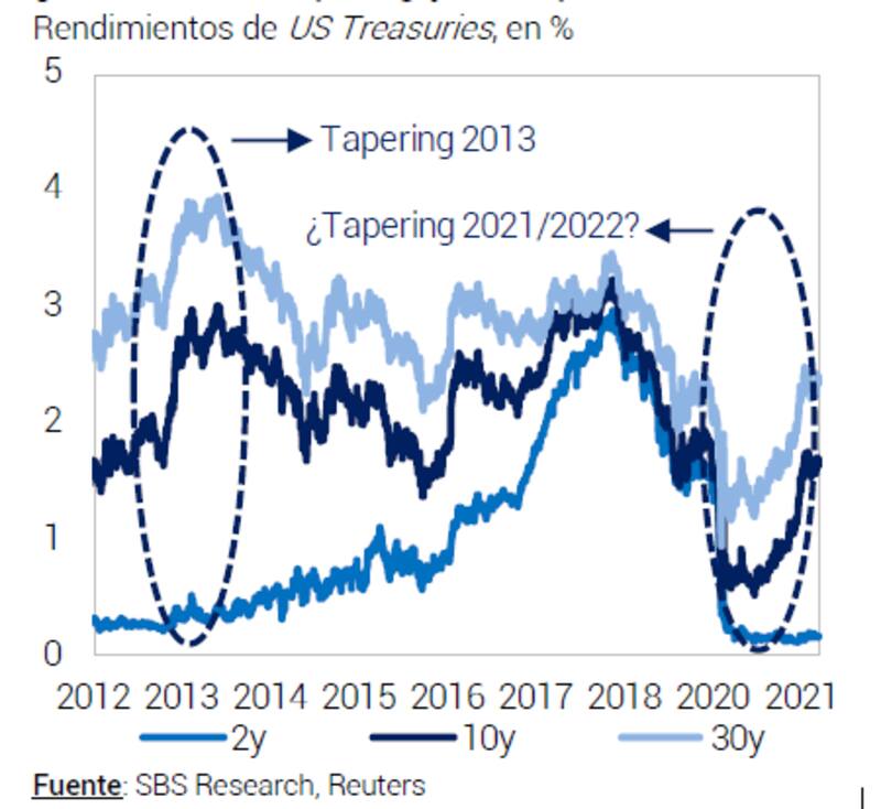 Juan Manuel Franco, economista de Grupo SBS entiende que los rendimientos de los bonos del tesoro americano marcan que el mercado ya comenzó a descontar una postura un poco menos laxa por parte de la Fed, al menos en cuanto al ritmo de compras de activos, (tapering).