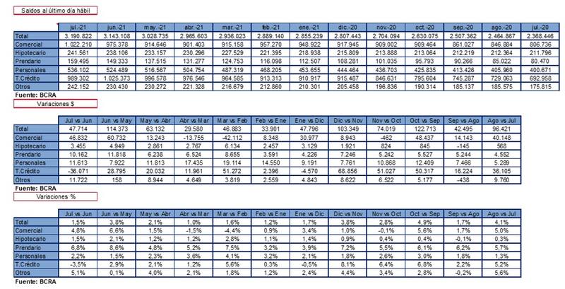 Estos últimos presentaron un saldo de $ 159.495 millones, creciendo 98,2% versus la cartera a fines del mismo mes de 2020 de $ 80.470 millones, superando ampliamente la inflación interanual. La variación con respecto al saldo del mes anterior, en tanto, marcó una suba del 6,8%, acumulando catorce alzas mensuales. En los seis meses a julio, la línea acumula un aumento de 41,8% y en el último trimestre un crecimiento de 21,5%.
