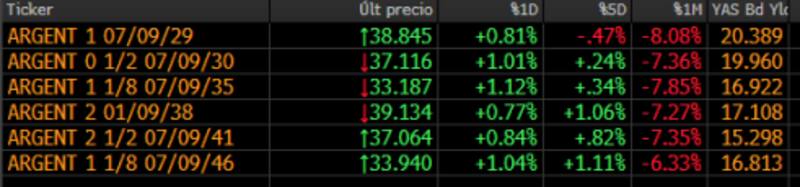 Entre los instrumentos argentinos soberanos emitidos bajo jurisdicción extranjera, todas fueron subas. El alza más importante la marcó el GD35, que ganó 1,12 por ciento. En tanto, el GD30 avanzó 1,01% y su tasa de retorno se ubica en torno al 20 por ciento.