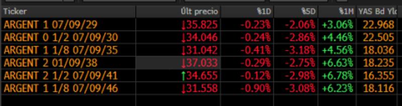 Entre los títulos emitidos bajo jurisdicción extranjera, la baja fue generalizada, aunque con retrocesos acotados. El que más terreno cedió fue el Global 2046 (GD46) que registró un rojo de 0,9%. El GD30, por su parte, perdió un 0,24% y su tasa interna de retorno supera ya el 22,5 por ciento.