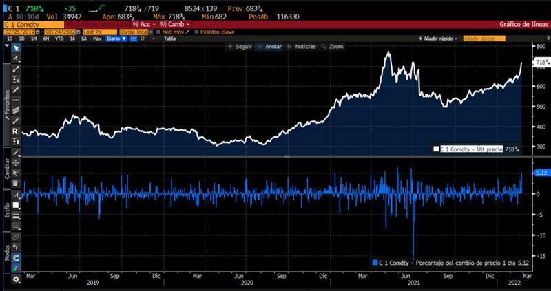 Con la misma sintonía, el maíz también sube 5% en el dia de hoy y regresa a zona de máximos históricos.