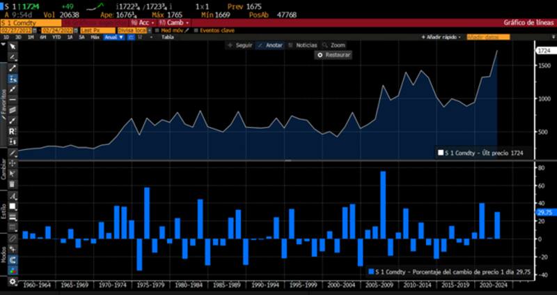 El rally también se ven en las materias primas, tales como el trigo, el maíz y la soja. Este último avanza 3% en el dia de hoy y se ubica en máximos históricos, operando en u$s 1724 centavos bushel.