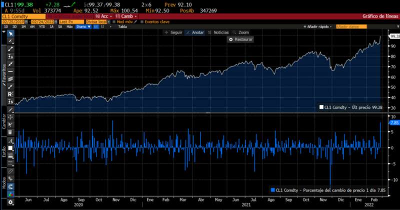 Como respuesta al inicio del conflicto bélico entre Rusia y Ucrania, los precios del petróleo se dispararon. El petróleo de referencia WTI avanza 7,5% aunque llego a subir hasta 9% durante el dia de hoy y supo tocar un máximo de u$s 100 el barril.