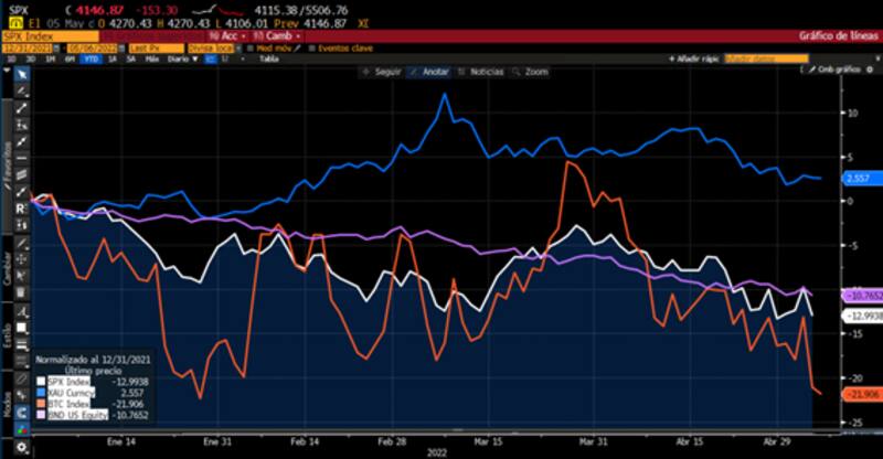 Si bien las acciones caen, también lo hacen los bonos. El oro no sube y las criptomonedas acompañan la tendencia bajista de Wall Street.