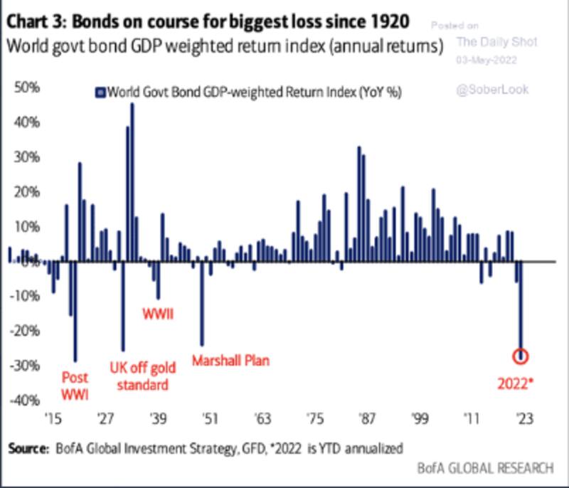 De esta manera, y según datos elaborados por los analistas de Bank of America (Bofa), la deuda soberana global se encuentra en el peor año desde 1920 al mostrar caídas cercanas al 30%.