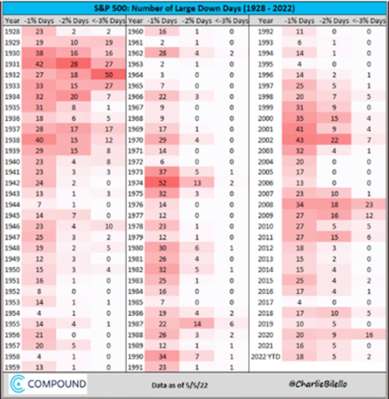 La volatilidad en Wall Street está siendo alta, con días operativos realmente extremos. De hecho, en lo que va de 2022, la cantidad de días en las que el S&P500 cayó más del 1% contabilizan 18. Esto ya supera a los 16 vistos en todo el 2021 y se acercan a los 20 de 2020.