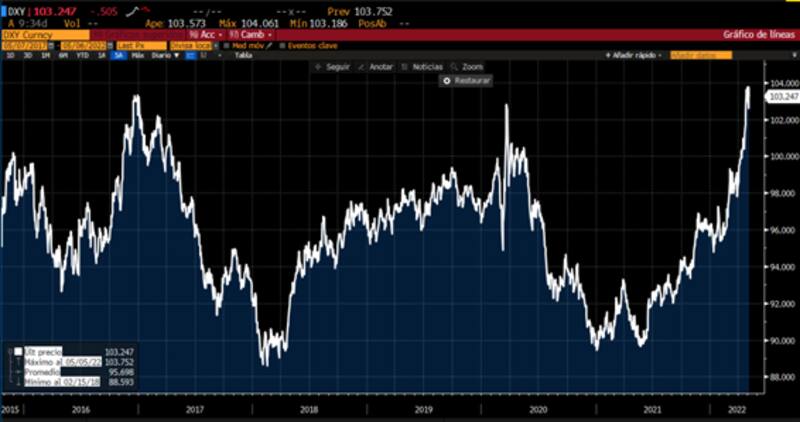 El Dólar Índex sube 8% este año y 15% desde el piso de 2021. Así, supera los máximos vistos en la pandemia y alcanza valores similares a los de 2016.
