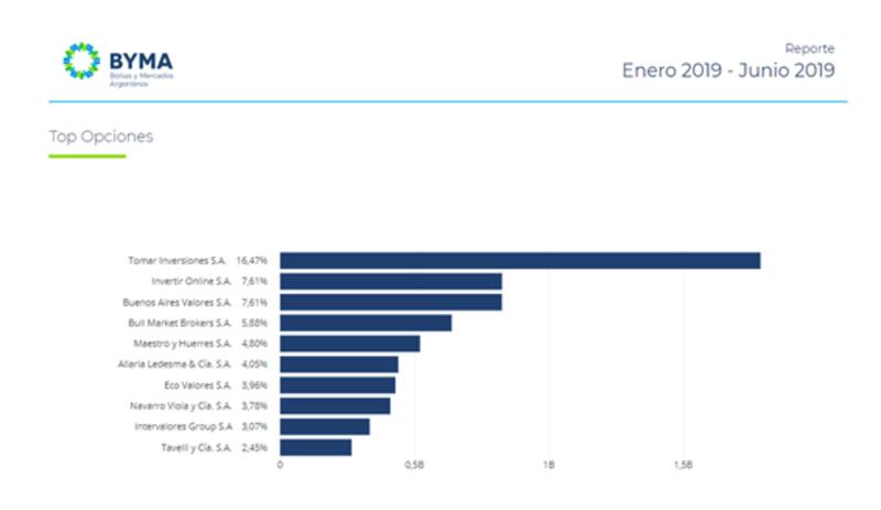 Finalmente, según el informe de BYMA, en el balance anual, Tomar Inversiones resultó ser la Alyc que mayor volumen concentró en el mercado de opciones con el 16,47% del total, seguido por I InvertirOnline.com y Buenos Aires Valores con el 7,61% cada uno.