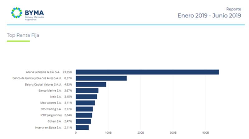 Al repasar el balance del primer semestre de 2019, se observa que el podio lo ocupan las mismas compañías, aunque con una ponderación distinta. Allaria Ledesma acaparó el 23,25% del total operado en bonos en lo que va de 2019, seguido por Banco Galicia y de Buenos Aires y Balanz con el 8,27% y 4,23% respectivamente.