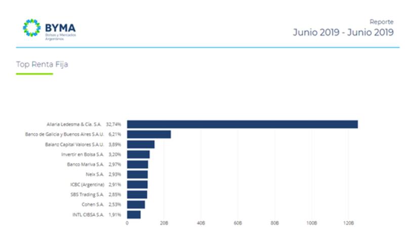 En lo que respecta al mercado de bonos, según el informe de BYMA, la Alyc que lideró en materia de volumen operado durante el mes de junio fue Allaria Ledesma con el 32,74% del total, seguido por Banco Galicia y Buenos Aires con el 6,2% y Balanz Capital con el 3,89%, entre los tres más importantes.