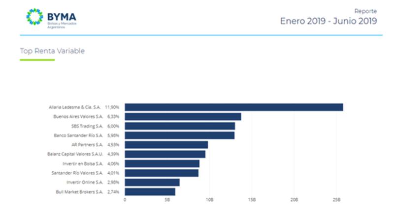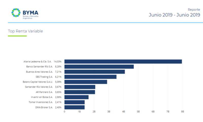 Según el informe de BYMA, el balance del primer semestre se destaca que el 11,9% del total operado en acciones fue llevado a cabo por Allaria Ledesma, seguido por Buenos Aires valores con el 6,33% y SBS Trading con el 6%.