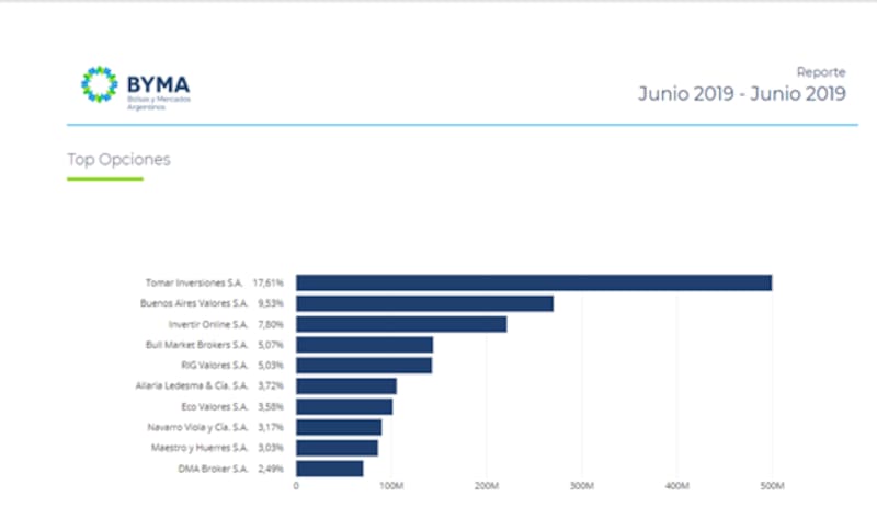 El ranking de BYMA sobre las 10 compañías que mayor volumen concentraron durante el mes de junio en opciones se encuentran Bull Market Brokers (5,07%), RIG Valores (5,03%), Allaria Ledesma (3,72%), Eco Valores (3,58%), Navarro Viola (3,17%), Maestro Huerres (3,03%) y DMA Brokers (2,49%)