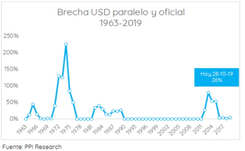 “Hubo controles cambiario en los tempranos años 60 y 70, casi todos los 80, entre 2011 y 2015, y ahora una nueva etapa iniciada a partir de septiembre de 2019. La brecha promedio desde 1963 fue del 20%. En tanto, en los años donde hubo controles subió al 55%, con un pico del 110% promedio entre 1971-1975. Entre el 2012 y 2015, la brecha en promedio fue 53% -con techo del 80% previo a la devaluación de enero 2014 , explicaron desde PPI.