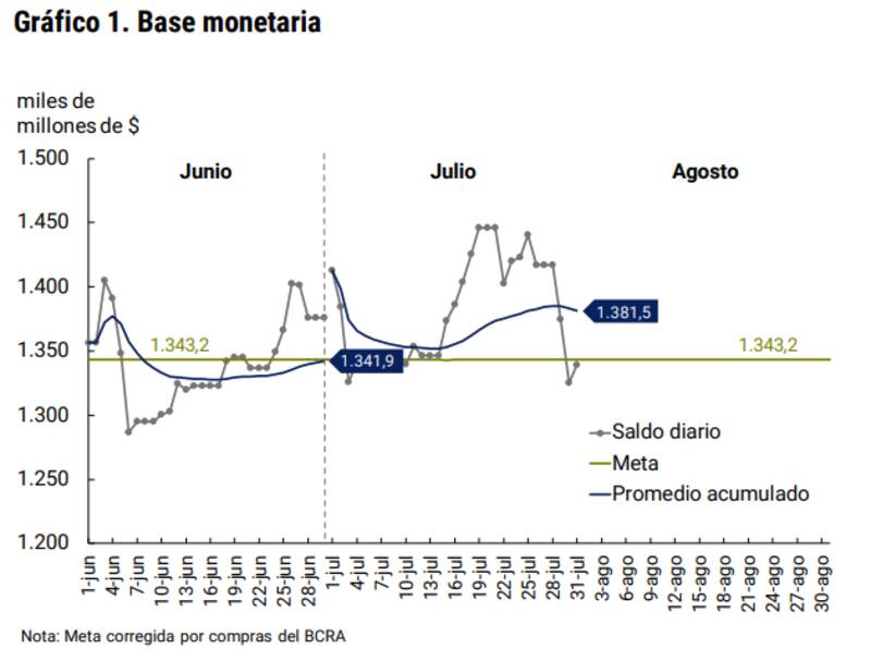 El Banco Central (BCRA) publicó hoy el informe de seguimiento de la base monetaria y mostró que cerró julio excedido de su meta. El promedio de la base monetaria alcanzó $ 1,381 billón hasta ayer, es decir, $ 38.300 millones (2,8%) por encima de la meta de $1,343 billón.