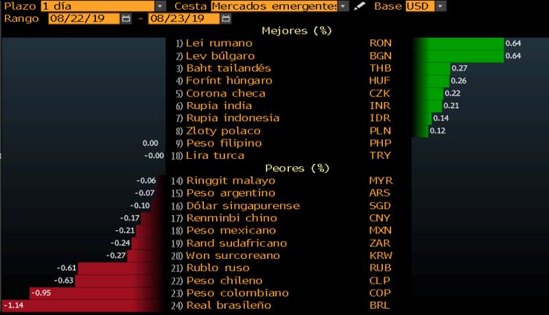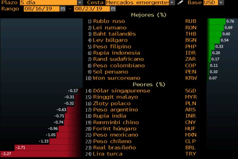 Con la suba globalizada de las monedas extranjeras, por una nueva escalada en la guerra comercial entre los Estados Unidos y China, las emergentes de países vecinos sufrieron también, con caídas de 1% el real, 0,70% el peso mexicano y 0,65% el peso chileno.
