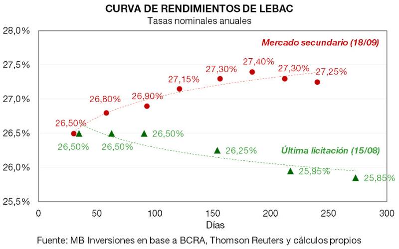 Gráfico con la última licitación primaria de Lebac, el 15 de agosto, contra el nivel de tasas de interés en el mercado secundario negociadas ayer.