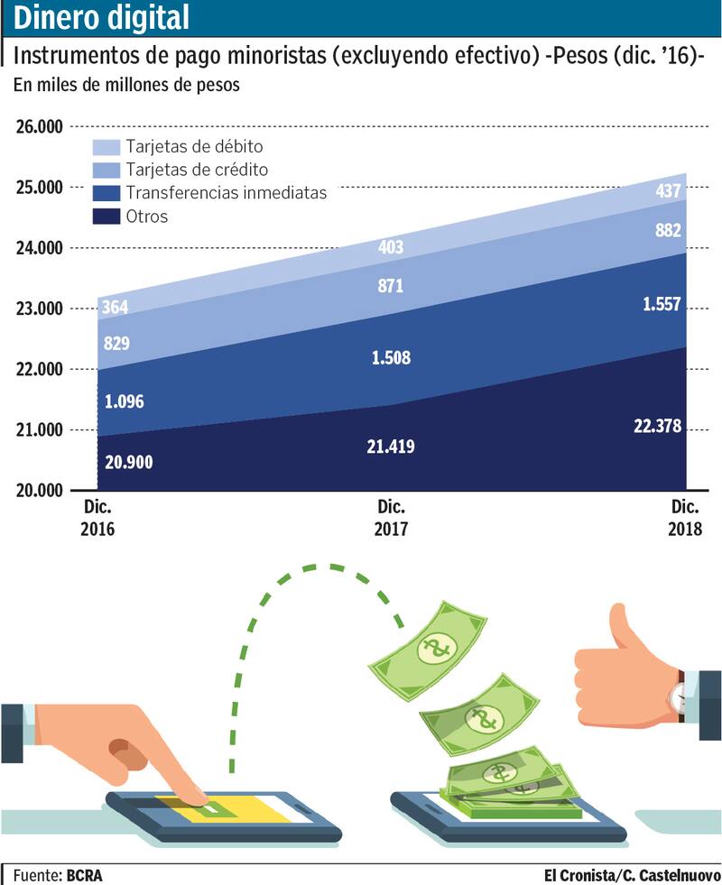 Las transferencias electrónicas crecieron un 60% el año pasado, lo que las transforma en uno de los canales de pago en efectivo que más desarrollo tuvieron el año pasado, según datos del Banco Central (BCRA). Con todo, el pago con tarjetas de débito y crédito sigue siendo el que más operaciones anota. La entidad, que desde 2015 dice tener entre sus objetivos la reducción en el uso de efectivo, dice que proyecta que el uso de tarjetas de débito crezca 53% en los próximos 5 años.