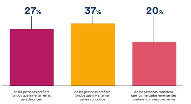 Según el informe de la compañía, el 27% de las personas prefiere fondos que invierten en su país de origen mientras que el 37% de las personas prefiere fondos que invierten en países conocidos. El 20% de las personas considera que los mercados emergentes conllevan un riesgo excesivo