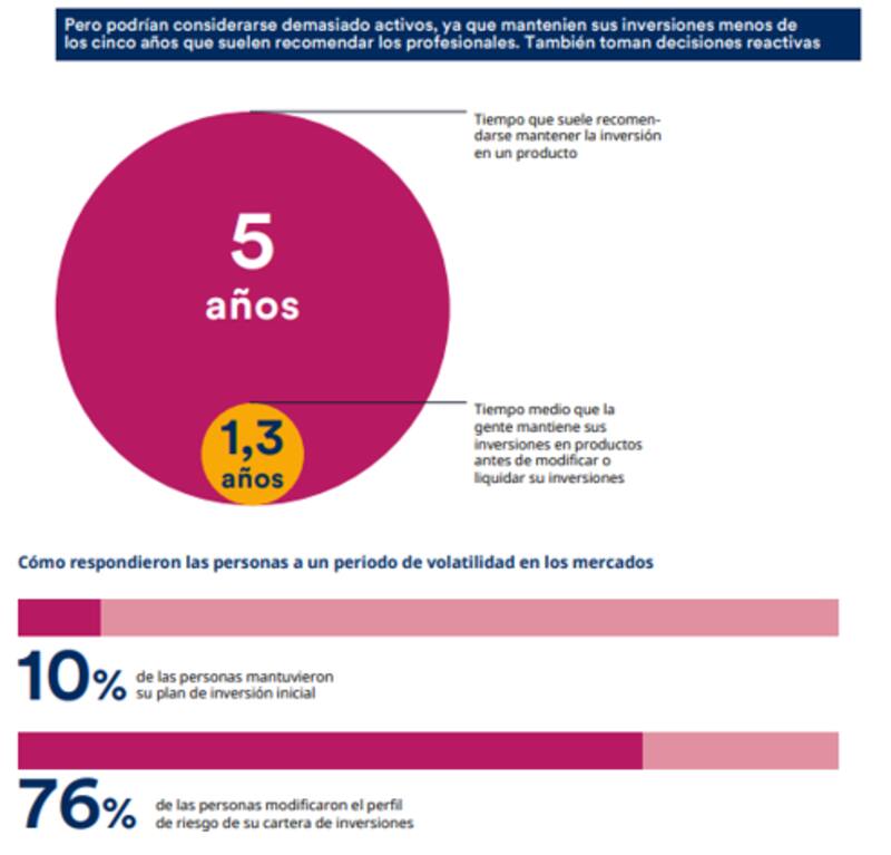 De vez en cuando, parece que las personas son demasiado activas con sus portafolios, arriesgándose a tomar decisiones reactivas e instintivas, sin contar con toda la información necesaria. Según la encuesta, los inversores en Argentina adoptan un enfoque activo en sus finanzas ya que el 87% de los encuestados admitió que revisan sus inversiones por lo menos una vez al mes. Además, afirmaron que podrían considerarse demasiado activos, ya que mantienen sus inversiones 1,3 años, muy por debajo de los cinco años que suelen recomendar los profesionales. Así, en el informe de la compañía resaltan también que los inversores locales suelen toman decisiones reactivas.
