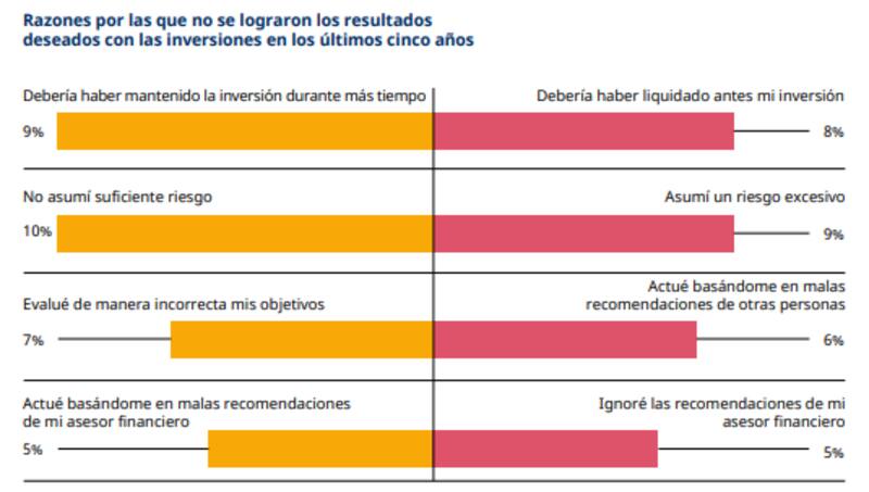 El 7% de los encuestados declaró haber evaluado de manera incorrecta sus objetivos o que ignoraron las recomendaciones de su asesor financiero. El 5% afirmo haber actuado basándose en malas recomendaciones del asesor financiero y el 6% actuaron en malas recomendaciones de otras personas.